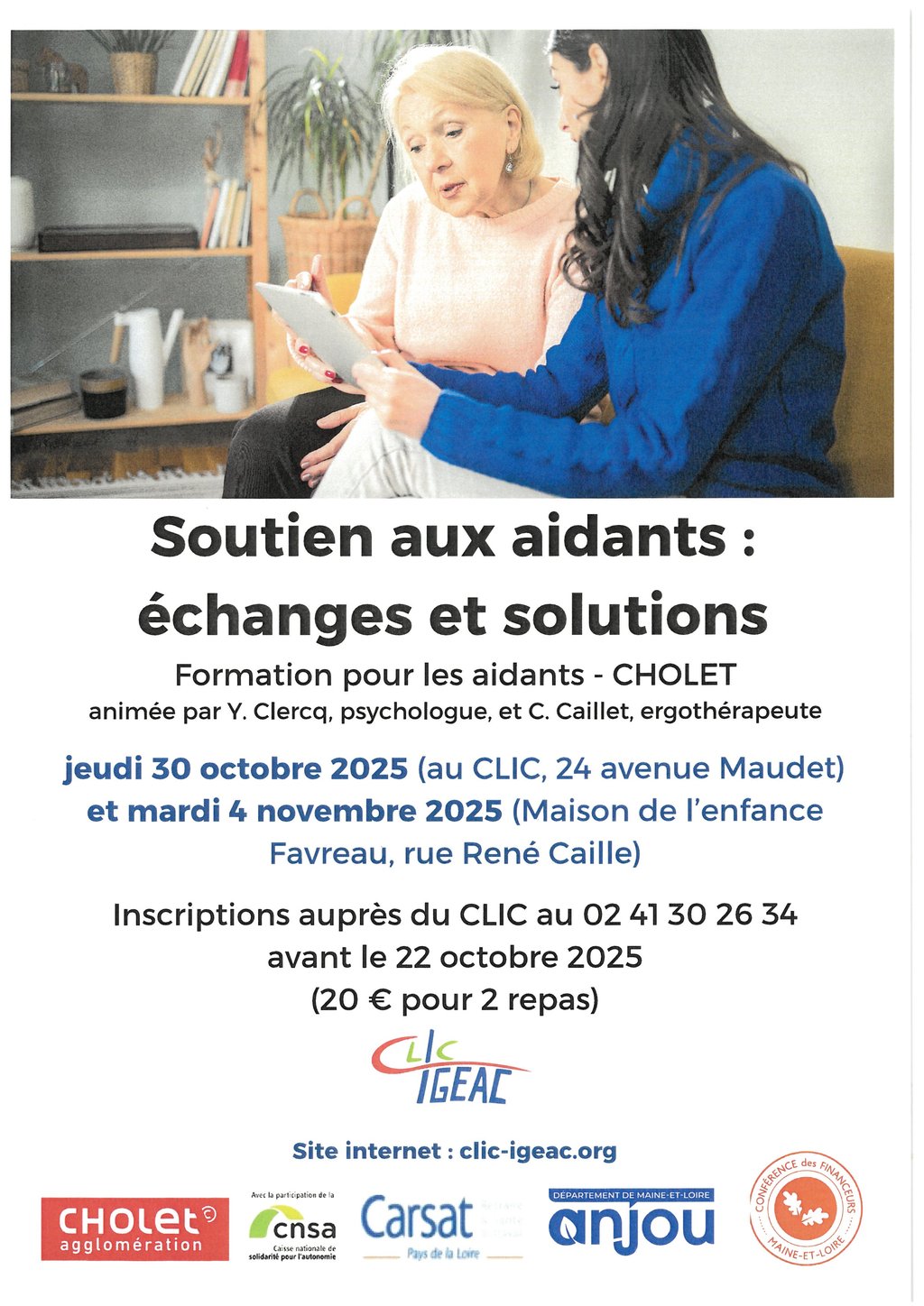 Le CLIC IGEAC vous informe de la prochaine formation pour les aidants : « Soutien aux aidants : échanges et solutions », animée par Yves Clercq, Psychologue, et Chantal Caillet, ergothérapeute, qui se déroulera le jeudi 30 octobre 2025 au CLIC IGEAC et le mardi 4 novembre 2025 à la Maison de l'Enfance Favreau à Cholet (inscription avant le 22 octobre 2025).