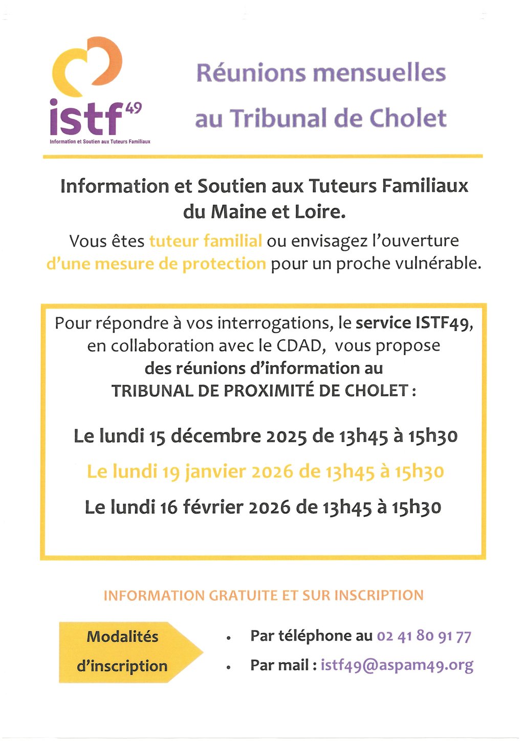 Le service d’Information et de Soutien aux Tuteurs Familiaux du Maine et Loire organise chaque mois une réunion d’information au Tribunal de Proximité de CHOLET, en collaboration avec le CDAD.