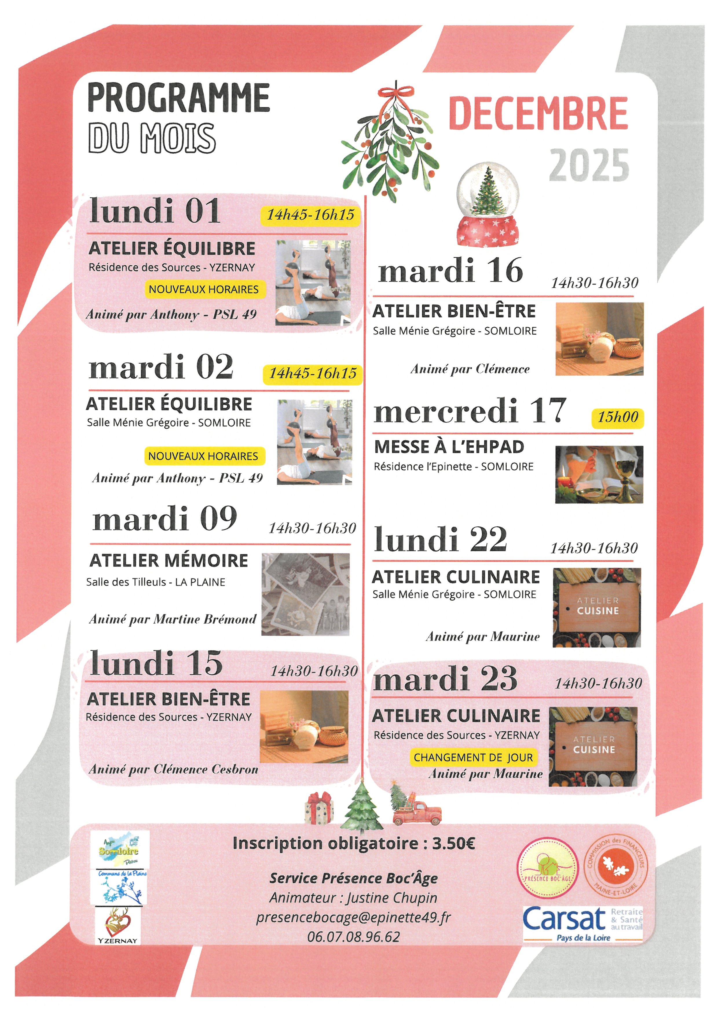 Programme des activités de Présence Boc'Âge, service de la résidence Vill'Âge l'Epinette de Somloire pour les mois de décembre 2025.