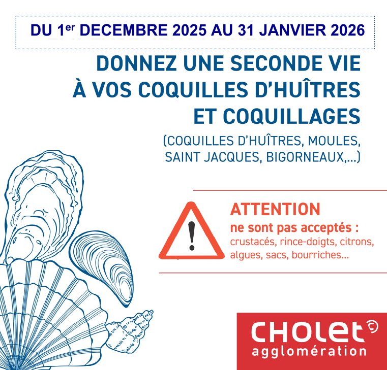 À l’approche des fêtes, Cholet Agglomération invite les habitants à participer à deux opérations de collecte saisonnière pour vos coquillages et vos sapins de Noël. Ces initiatives permettent de limiter les déchets tout en favorisant leur valorisation locale.
